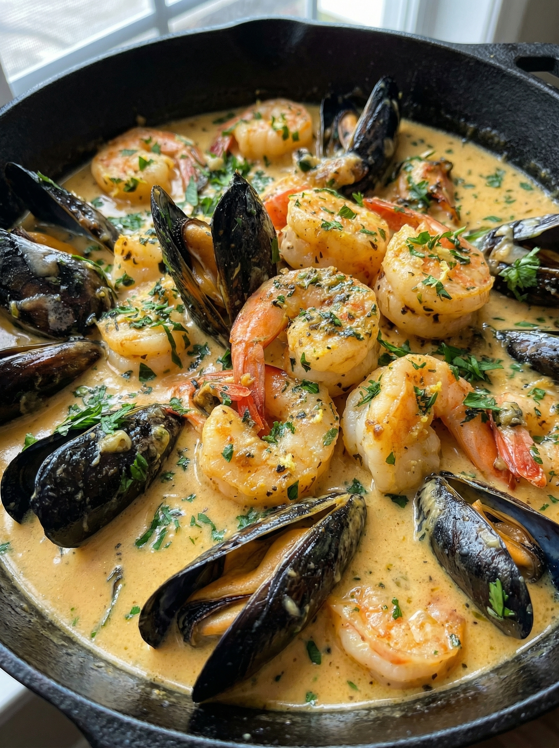 Shrimp and Mussels in Creamy Garlic Sauce