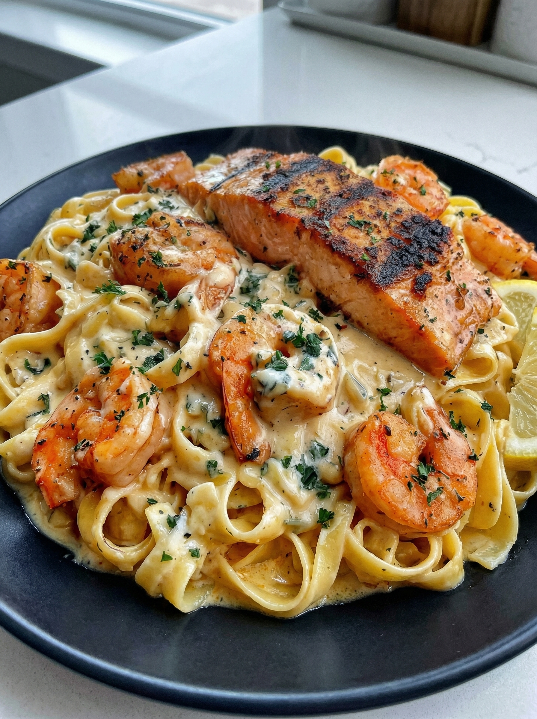Salmon and Shrimp Alfredo