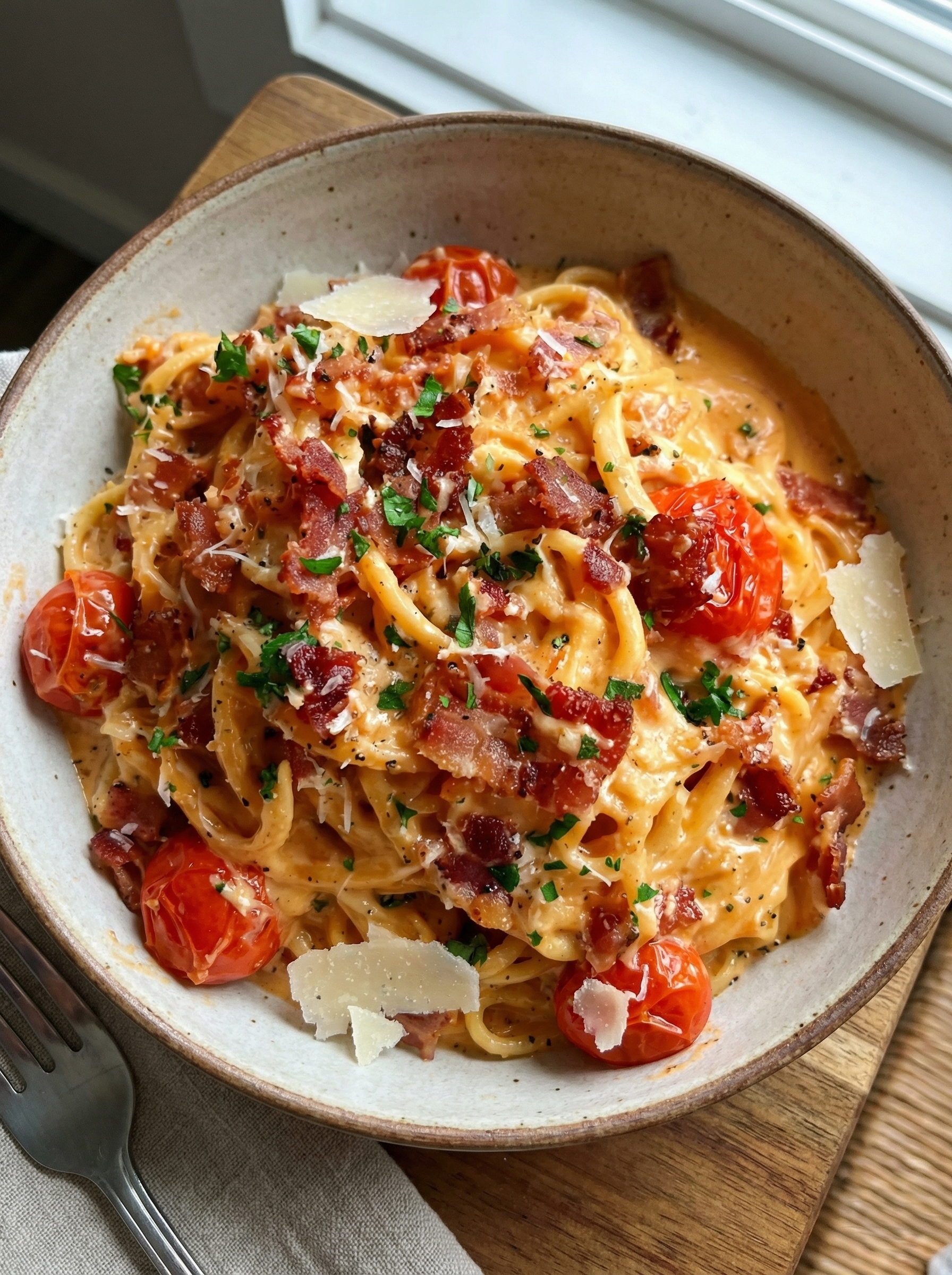 Creamy Bacon Pasta with Tomato Cream Sauce